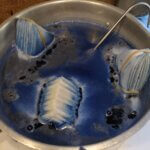 värde, material i grytorna och överfärgningar ger olika färger. Vi färgar tyg med eco-print och Shibori.